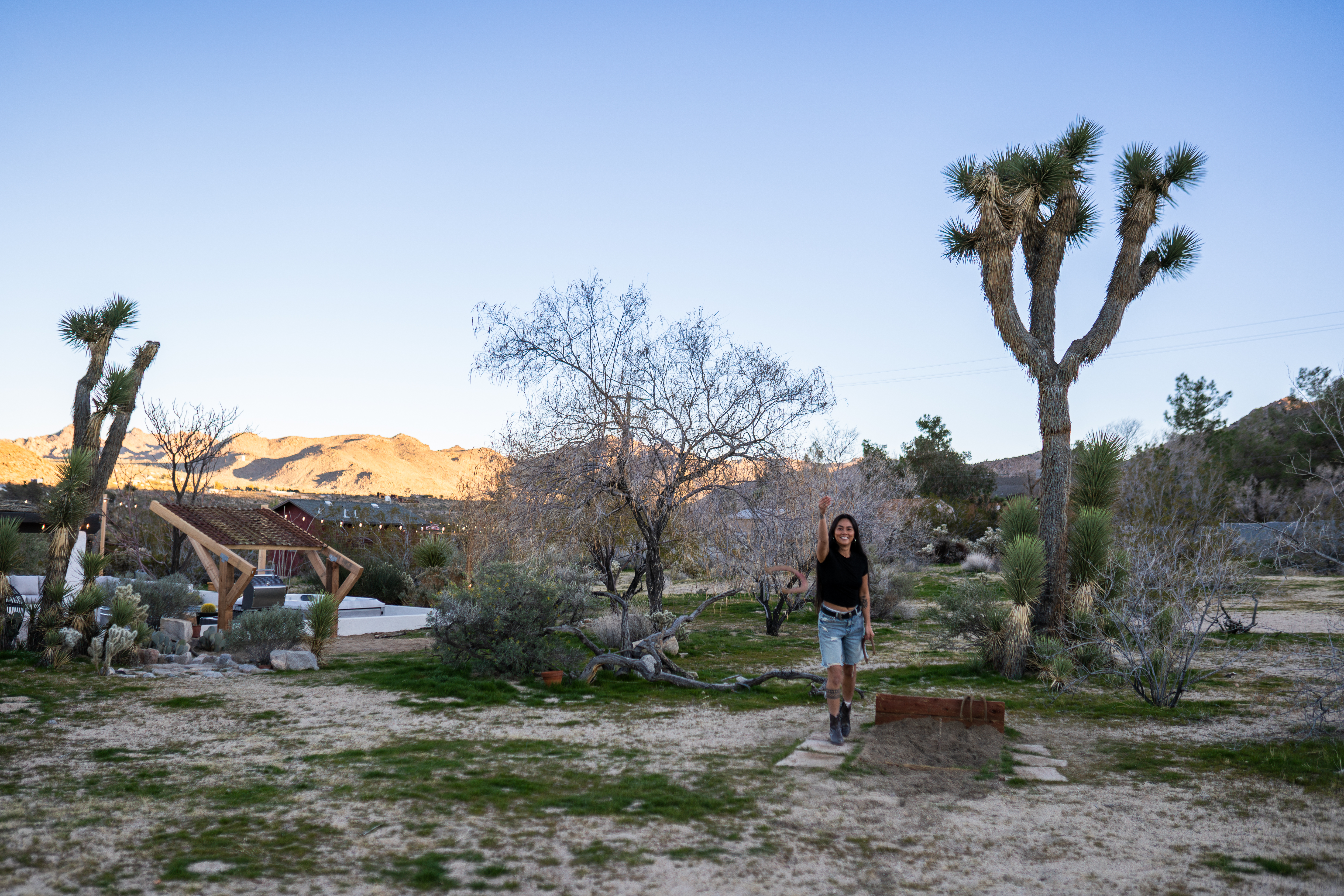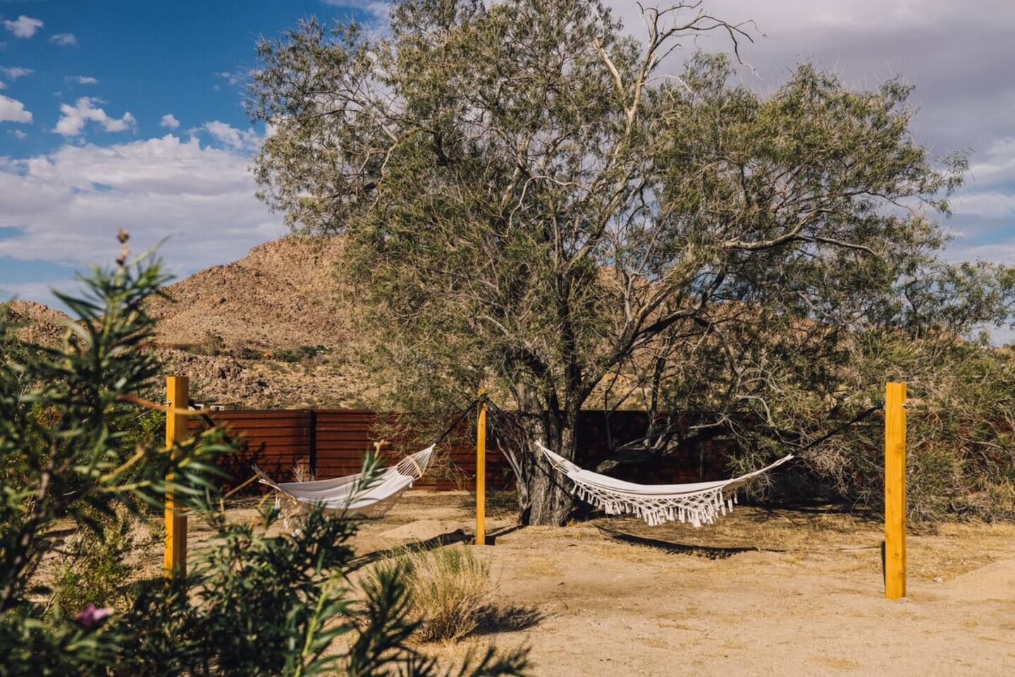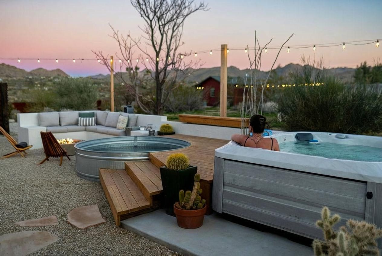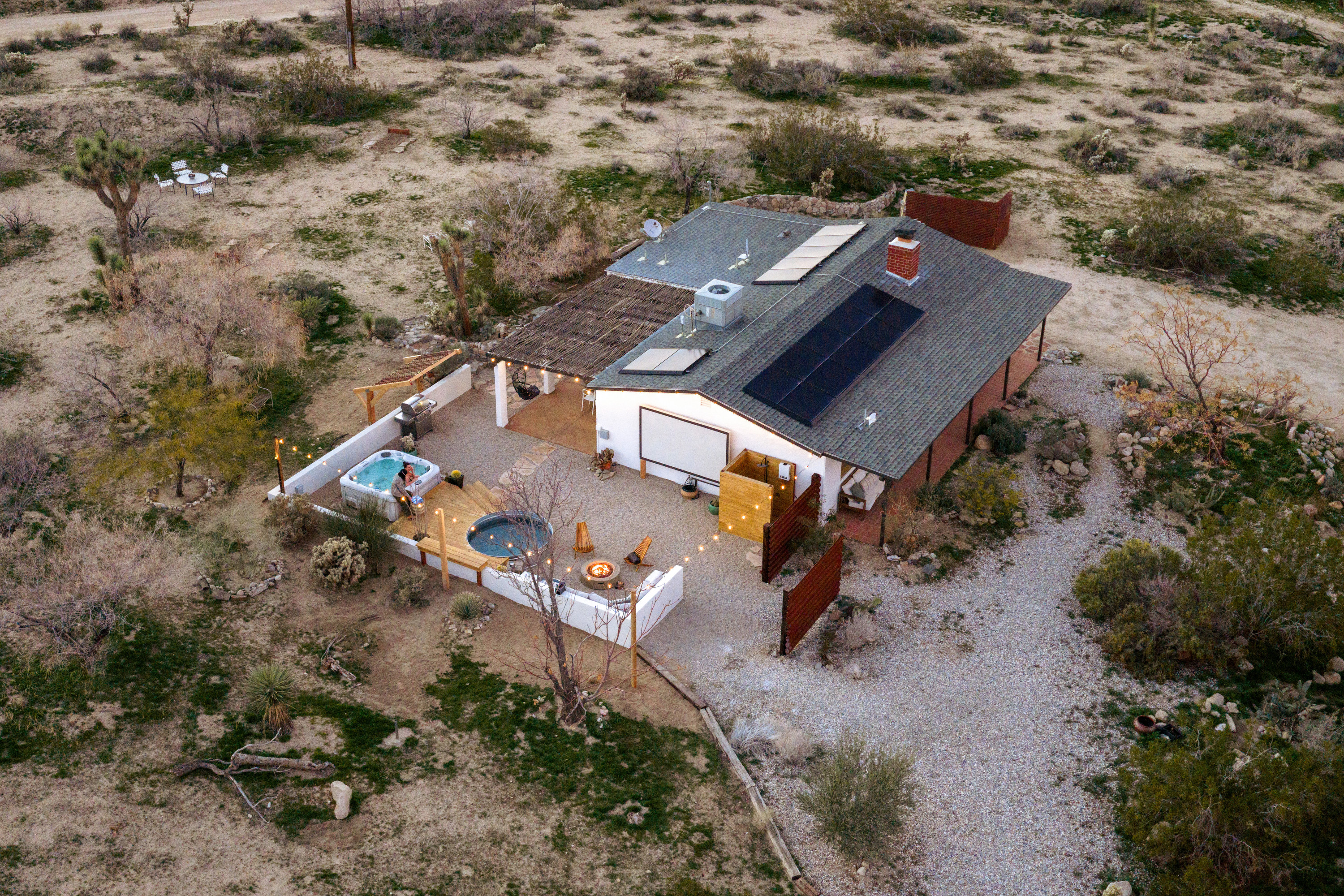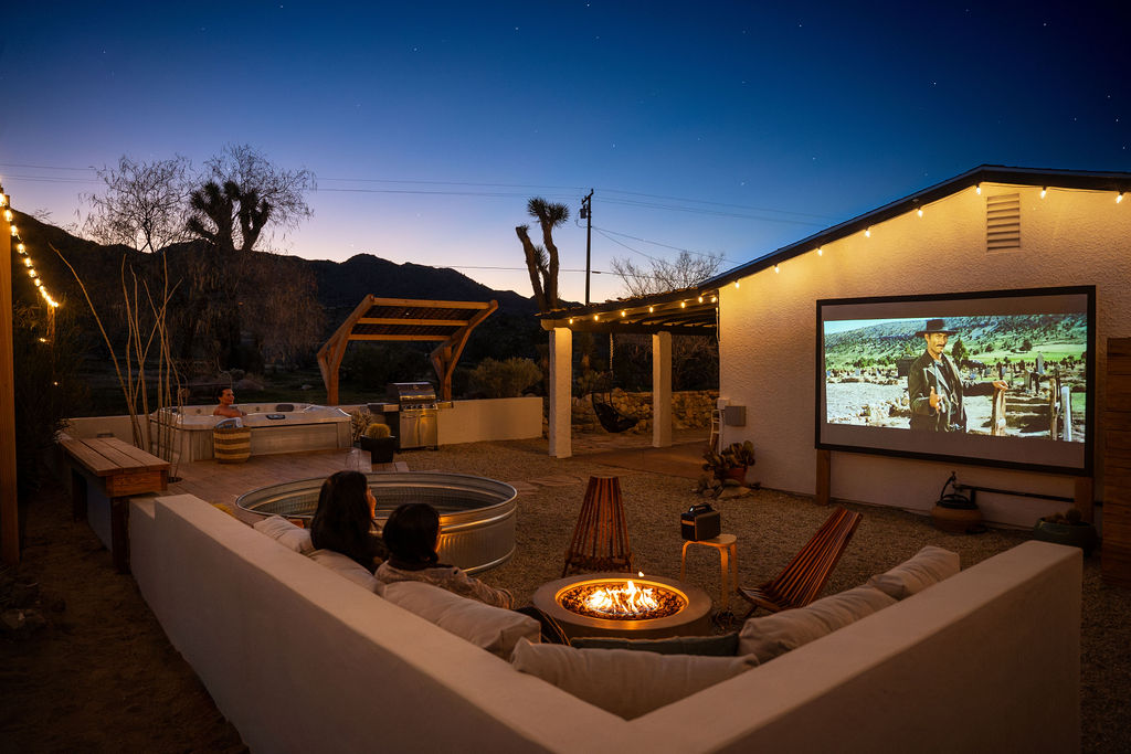 Sleeps 7 comfortably, up to 9 guests Bedroom 1: King bed Bedroom 2: Bunk bed (Twin XL over Queen) Bedroom 3: Queen bed Additional guests 8-9: Fold-out memory foam twin mattresses available ($25/person/night) Pack-n-play available for babies. The Perfect Location Roadrunner Ranch sits in Joshua Tree Highlands—the area's most coveted neighborhood. You're 4 minutes from downtown Joshua Tree in one direction, 4 minutes to the park's west entrance in the other. The property is directly off paved Quail Springs Road, while most rentals in the area require long drives down rough dirt roads. Location is consistently our guests' favorite feature—and for good reason. Key Amenities: ★ Hot tub + stock tank soaking tub (April-October) ★ Outdoor movie theater with projector ★ Built-in L-shaped couch with fire pit ★ Covered patio dining for 8 ★ BBQ area with Weber grill ★ Open-concept kitchen with stainless appliances ★ 2 full bathrooms (primary ensuite with rain shower) ★ Front porch with sunrise views ★ Hammocks ★ Horseshoe pit ★ Built-in desks in 2 bedrooms ★ TVs with Roku in living room and bunk bedroom ★ String lights throughout ★ EV charging (Level 2 J1772) Layout & Living Spaces The open-concept layout flows seamlessly from living room to dining to kitchen—ideal for gathering. Floor-to-ceiling windows frame sweeping desert views, while a striking local stone fireplace (decorative) anchors the living area. The fully-equipped kitchen features stainless appliances and ample prep space. All beds feature premium mattresses and hotel-quality cotton linens. The bunk bedroom includes a TV with Roku and closet storage for the fold-out floor mattresses. Outdoor Oasis The outdoor crown jewel: grab blankets from inside the sliding door and enjoy movies on the big screen from the built-in fire pit couch. Set up the portable projector (2-3 hour battery, extension cord available) and let separate string light controls set the perfect mood. When finished, return the projector to its spot inside. Adjacent to the fire pit lounge, unwind on the open-air deck with a hot tub and stock tank soaking tub (filled April-October). Start mornings on the front porch with coffee and sunrise views over the desert. The covered back patio offers dining for 8 with a Weber BBQ—perfect for meals with mountain vistas. Explore the property's stunning joshua trees, cacti and other flora, lounge in the hammocks by the large willow, or challenge friends to horseshoes by the mature joshua trees. The Cabin A separate 2-person cabin sits 150 feet from the main house with its own driveway and complete privacy—typically rented independently, but available to add to your reservation. If occupied by other guests, you likely won't see or hear them.