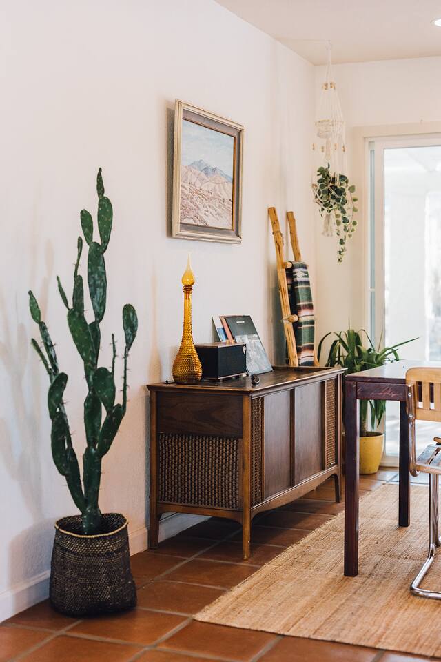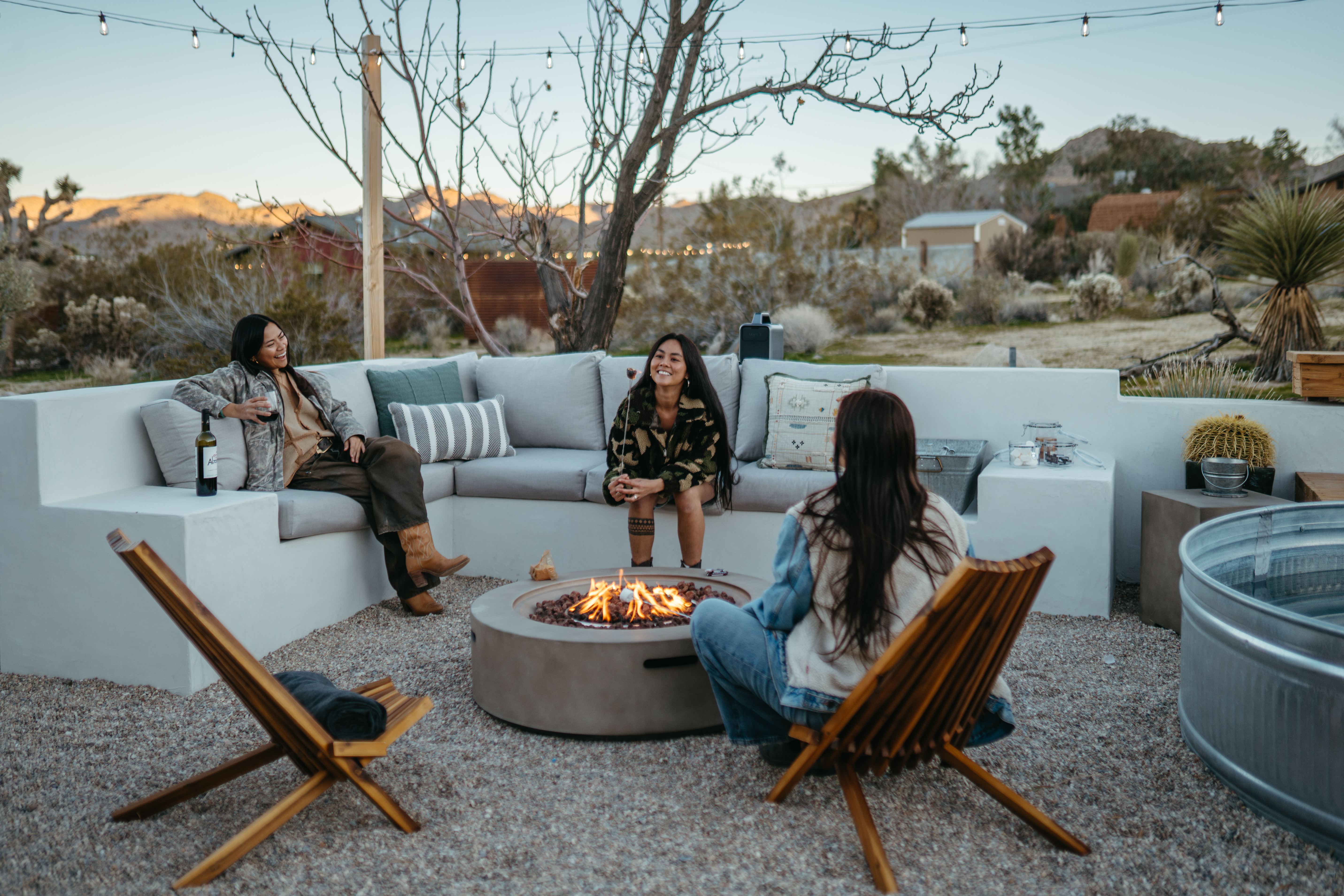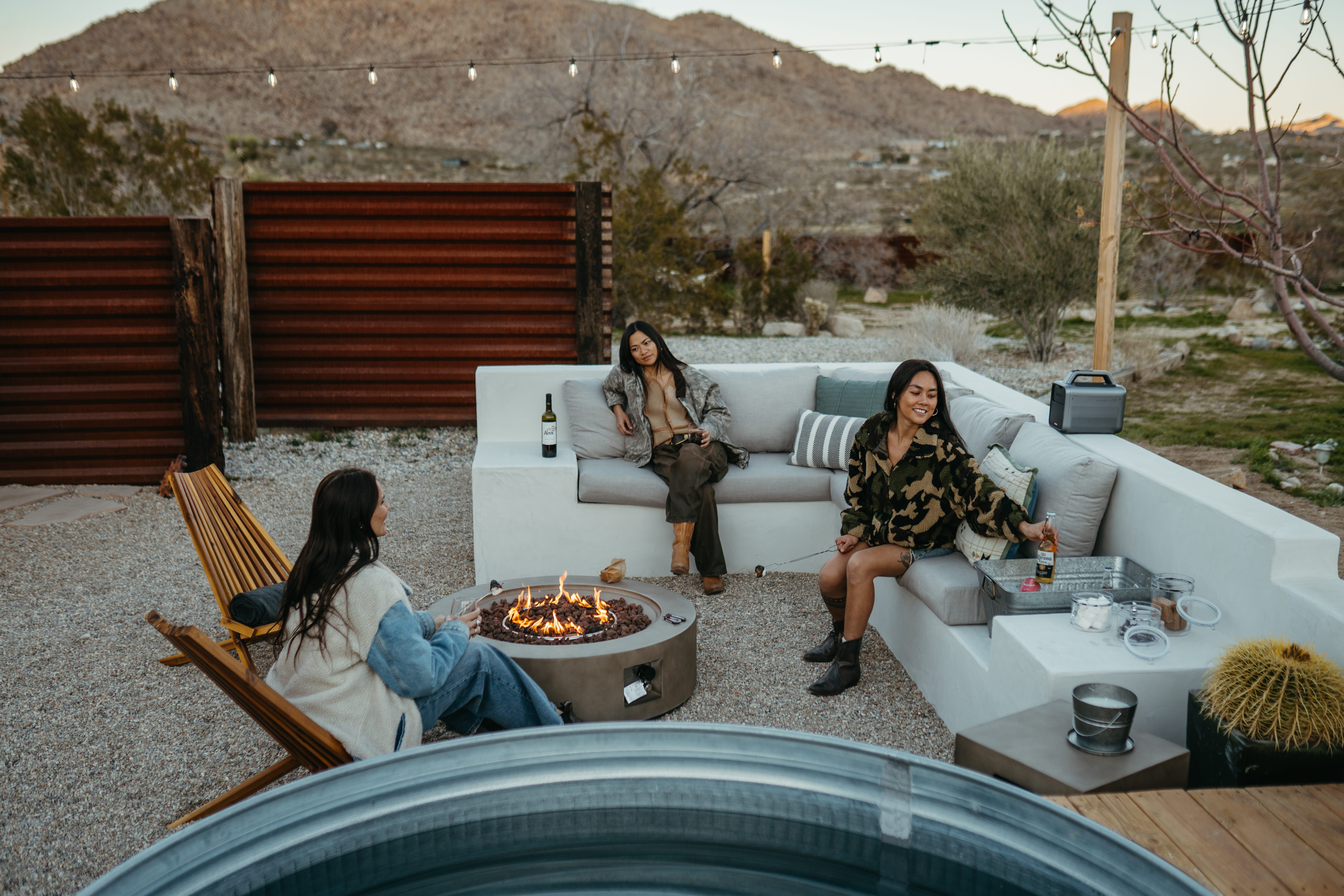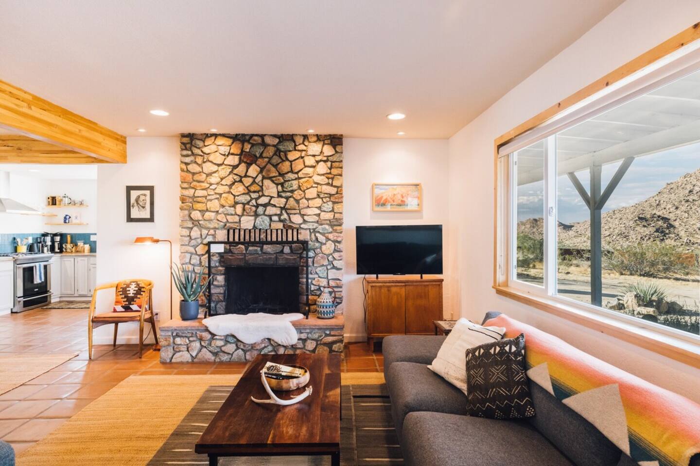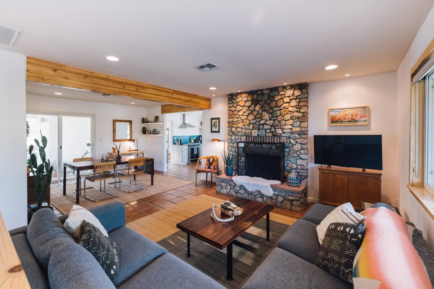 Sleeps 7 comfortably, up to 9 guests Bedroom 1: King bed Bedroom 2: Bunk bed (Twin XL over Queen) Bedroom 3: Queen bed Additional guests 8-9: Fold-out memory foam twin mattresses available ($25/person/night) Pack-n-play available for babies. The Perfect Location Roadrunner Ranch sits in Joshua Tree Highlands—the area's most coveted neighborhood. You're 4 minutes from downtown Joshua Tree in one direction, 4 minutes to the park's west entrance in the other. The property is directly off paved Quail Springs Road, while most rentals in the area require long drives down rough dirt roads. Location is consistently our guests' favorite feature—and for good reason. Key Amenities: ★ Hot tub + stock tank soaking tub (April-October) ★ Outdoor movie theater with projector ★ Built-in L-shaped couch with fire pit ★ Covered patio dining for 8 ★ BBQ area with Weber grill ★ Open-concept kitchen with stainless appliances ★ 2 full bathrooms (primary ensuite with rain shower) ★ Front porch with sunrise views ★ Hammocks ★ Horseshoe pit ★ Built-in desks in 2 bedrooms ★ TVs with Roku in living room and bunk bedroom ★ String lights throughout ★ EV charging (Level 2 J1772) Layout & Living Spaces The open-concept layout flows seamlessly from living room to dining to kitchen—ideal for gathering. Floor-to-ceiling windows frame sweeping desert views, while a striking local stone fireplace (decorative) anchors the living area. The fully-equipped kitchen features stainless appliances and ample prep space. All beds feature premium mattresses and hotel-quality cotton linens. The bunk bedroom includes a TV with Roku and closet storage for the fold-out floor mattresses. Outdoor Oasis The outdoor crown jewel: grab blankets from inside the sliding door and enjoy movies on the big screen from the built-in fire pit couch. Set up the portable projector (2-3 hour battery, extension cord available) and let separate string light controls set the perfect mood. When finished, return the projector to its spot inside. Adjacent to the fire pit lounge, unwind on the open-air deck with a hot tub and stock tank soaking tub (filled April-October). Start mornings on the front porch with coffee and sunrise views over the desert. The covered back patio offers dining for 8 with a Weber BBQ—perfect for meals with mountain vistas. Explore the property's stunning joshua trees, cacti and other flora, lounge in the hammocks by the large willow, or challenge friends to horseshoes by the mature joshua trees. The Cabin A separate 2-person cabin sits 150 feet from the main house with its own driveway and complete privacy—typically rented independently, but available to add to your reservation. If occupied by other guests, you likely won't see or hear them.