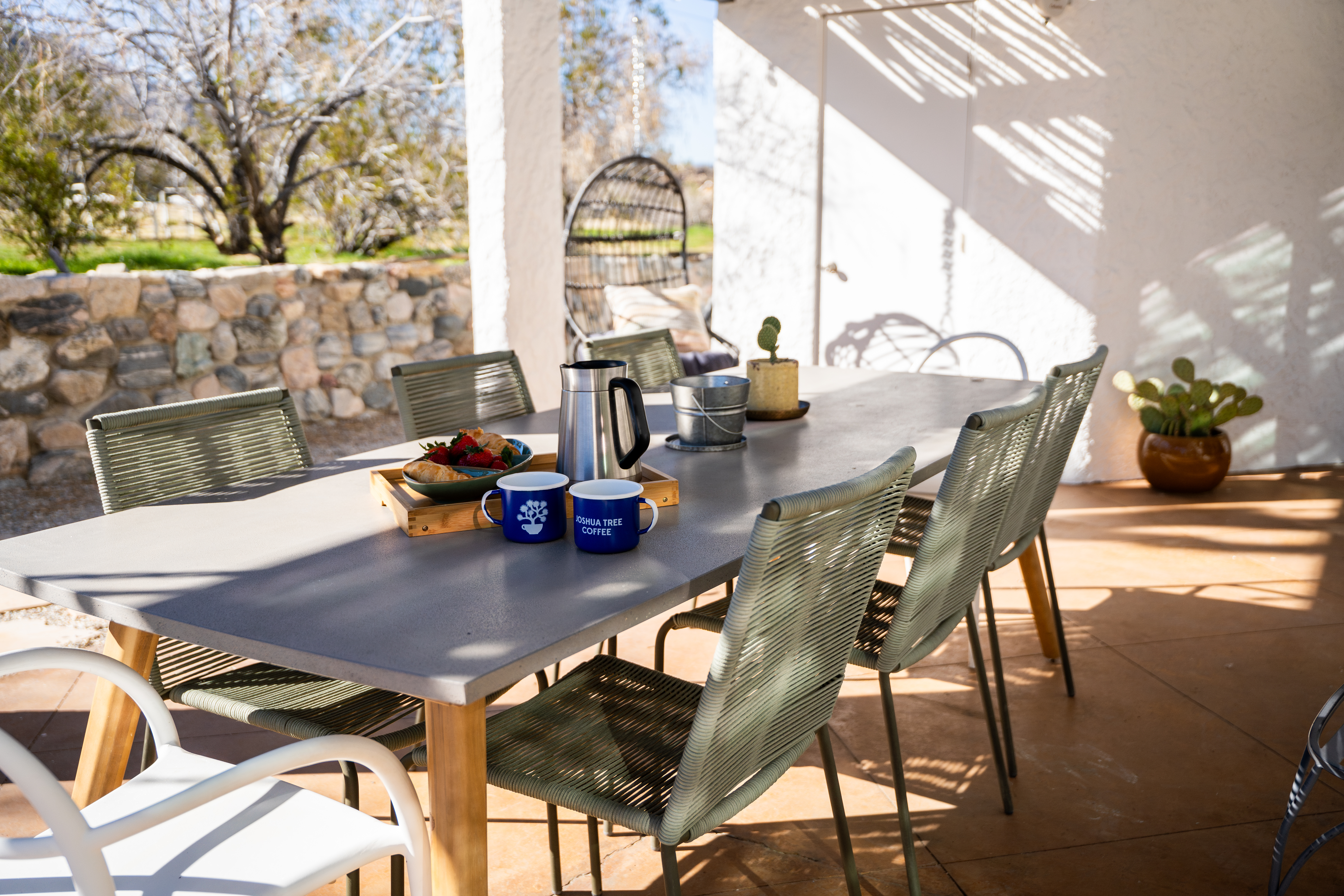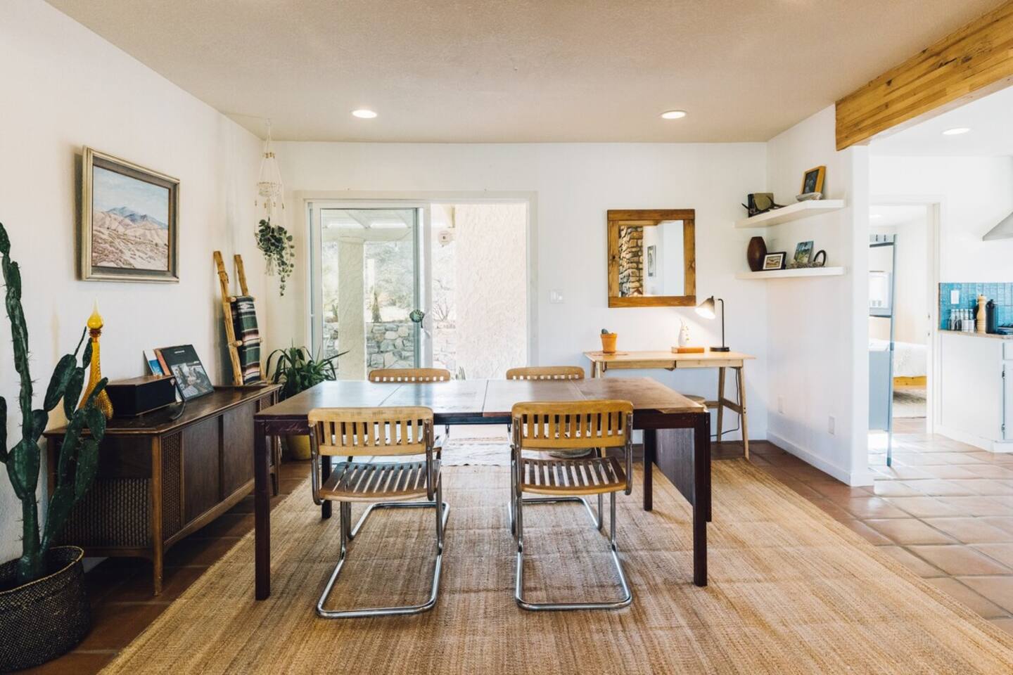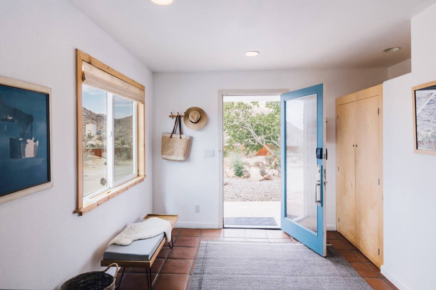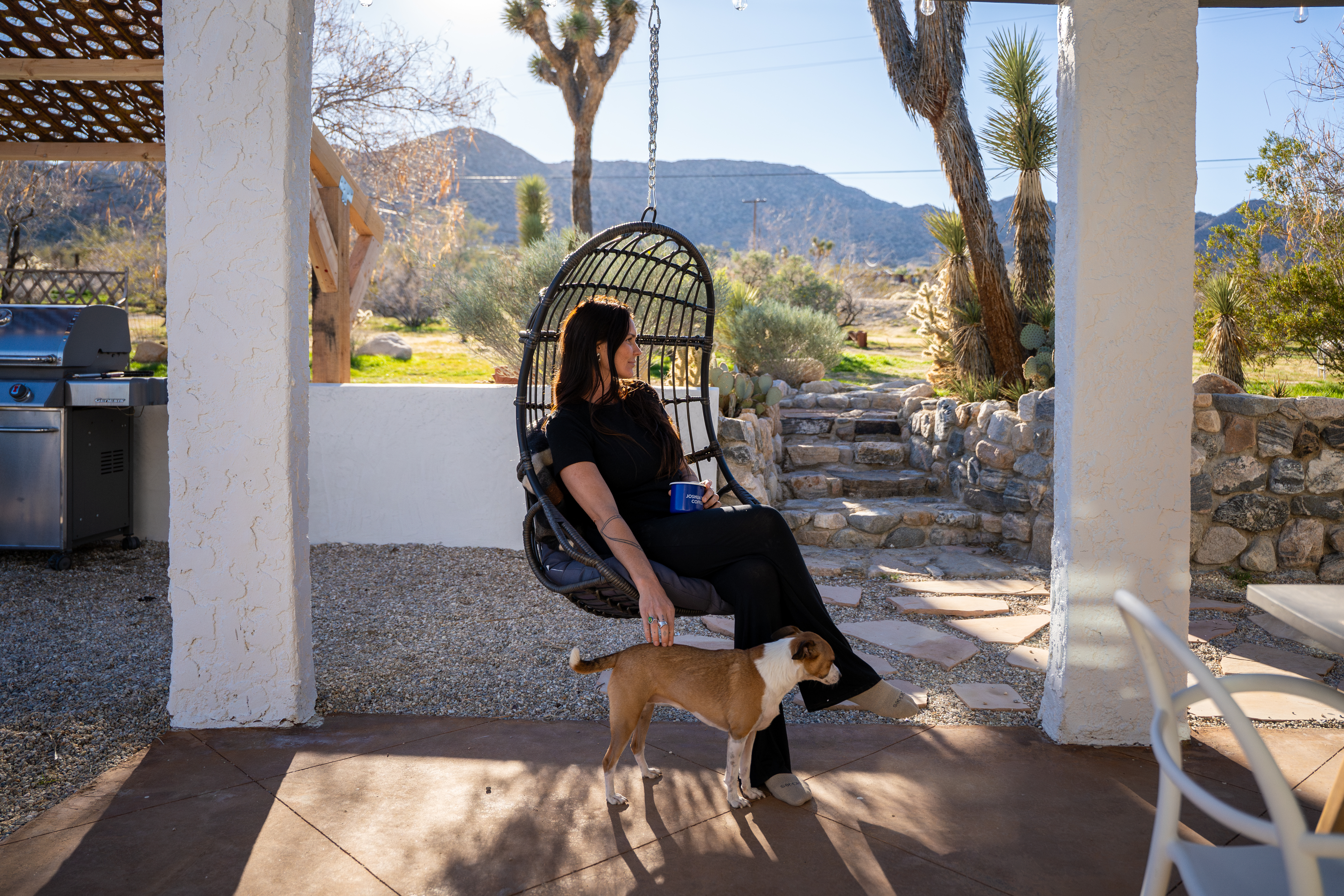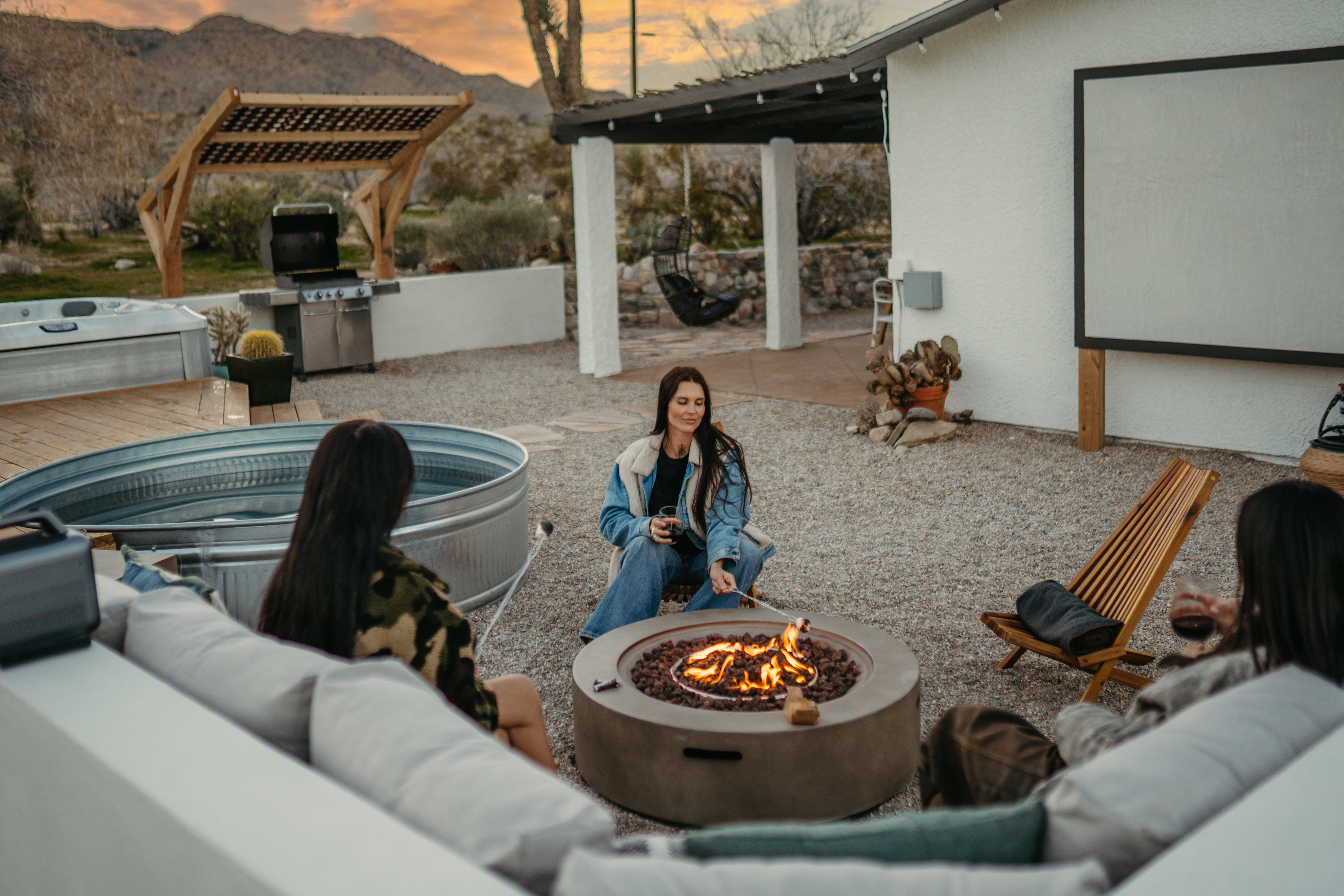 Sleeps 7 comfortably, up to 9 guests Bedroom 1: King bed Bedroom 2: Bunk bed (Twin XL over Queen) Bedroom 3: Queen bed Additional guests 8-9: Fold-out memory foam twin mattresses available ($25/person/night) Pack-n-play available for babies. The Perfect Location Roadrunner Ranch sits in Joshua Tree Highlands—the area's most coveted neighborhood. You're 4 minutes from downtown Joshua Tree in one direction, 4 minutes to the park's west entrance in the other. The property is directly off paved Quail Springs Road, while most rentals in the area require long drives down rough dirt roads. Location is consistently our guests' favorite feature—and for good reason. Key Amenities: ★ Hot tub + stock tank soaking tub (April-October) ★ Outdoor movie theater with projector ★ Built-in L-shaped couch with fire pit ★ Covered patio dining for 8 ★ BBQ area with Weber grill ★ Open-concept kitchen with stainless appliances ★ 2 full bathrooms (primary ensuite with rain shower) ★ Front porch with sunrise views ★ Hammocks ★ Horseshoe pit ★ Built-in desks in 2 bedrooms ★ TVs with Roku in living room and bunk bedroom ★ String lights throughout ★ EV charging (Level 2 J1772) Layout & Living Spaces The open-concept layout flows seamlessly from living room to dining to kitchen—ideal for gathering. Floor-to-ceiling windows frame sweeping desert views, while a striking local stone fireplace (decorative) anchors the living area. The fully-equipped kitchen features stainless appliances and ample prep space. All beds feature premium mattresses and hotel-quality cotton linens. The bunk bedroom includes a TV with Roku and closet storage for the fold-out floor mattresses. Outdoor Oasis The outdoor crown jewel: grab blankets from inside the sliding door and enjoy movies on the big screen from the built-in fire pit couch. Set up the portable projector (2-3 hour battery, extension cord available) and let separate string light controls set the perfect mood. When finished, return the projector to its spot inside. Adjacent to the fire pit lounge, unwind on the open-air deck with a hot tub and stock tank soaking tub (filled April-October). Start mornings on the front porch with coffee and sunrise views over the desert. The covered back patio offers dining for 8 with a Weber BBQ—perfect for meals with mountain vistas. Explore the property's stunning joshua trees, cacti and other flora, lounge in the hammocks by the large willow, or challenge friends to horseshoes by the mature joshua trees. The Cabin A separate 2-person cabin sits 150 feet from the main house with its own driveway and complete privacy—typically rented independently, but available to add to your reservation. If occupied by other guests, you likely won't see or hear them.