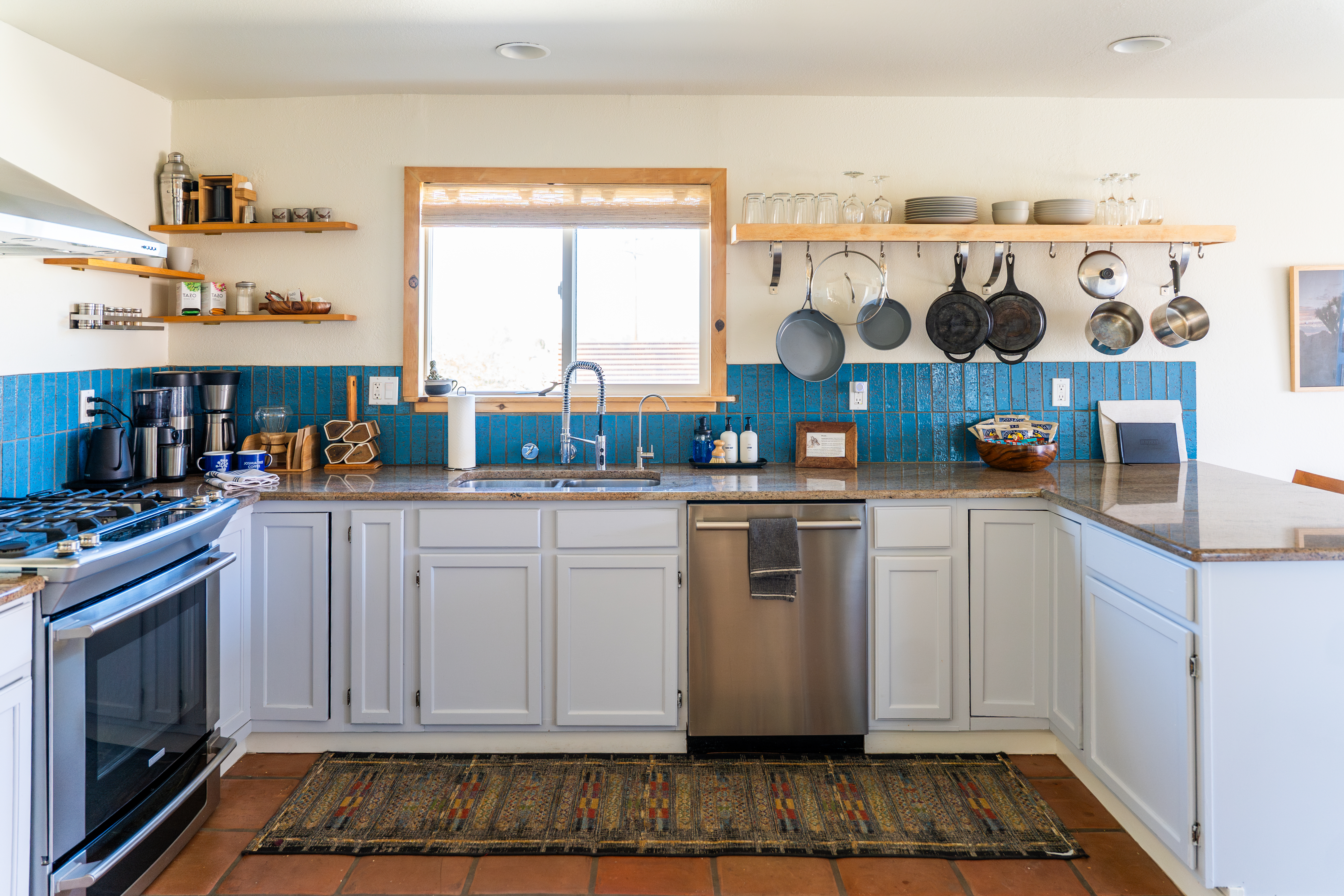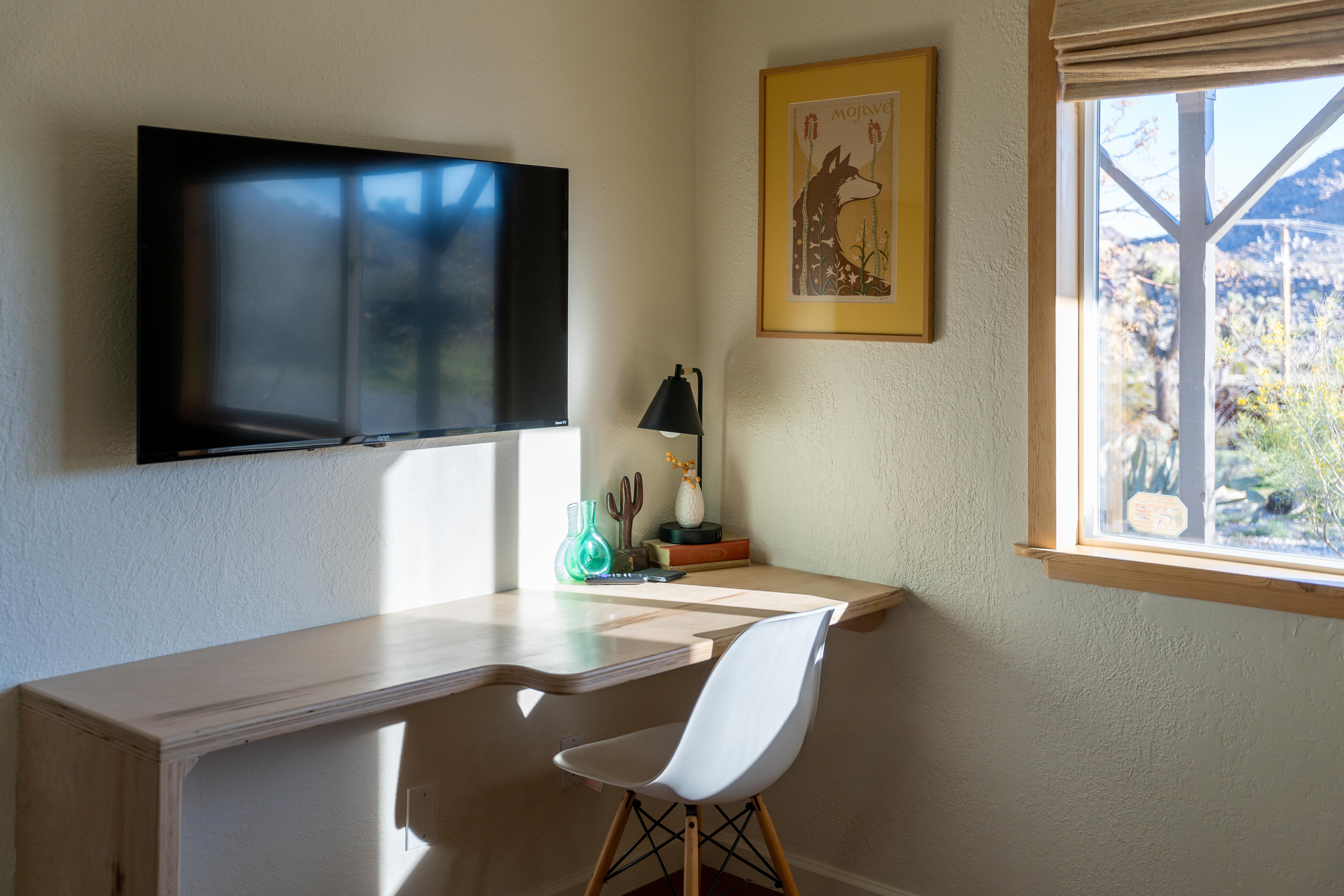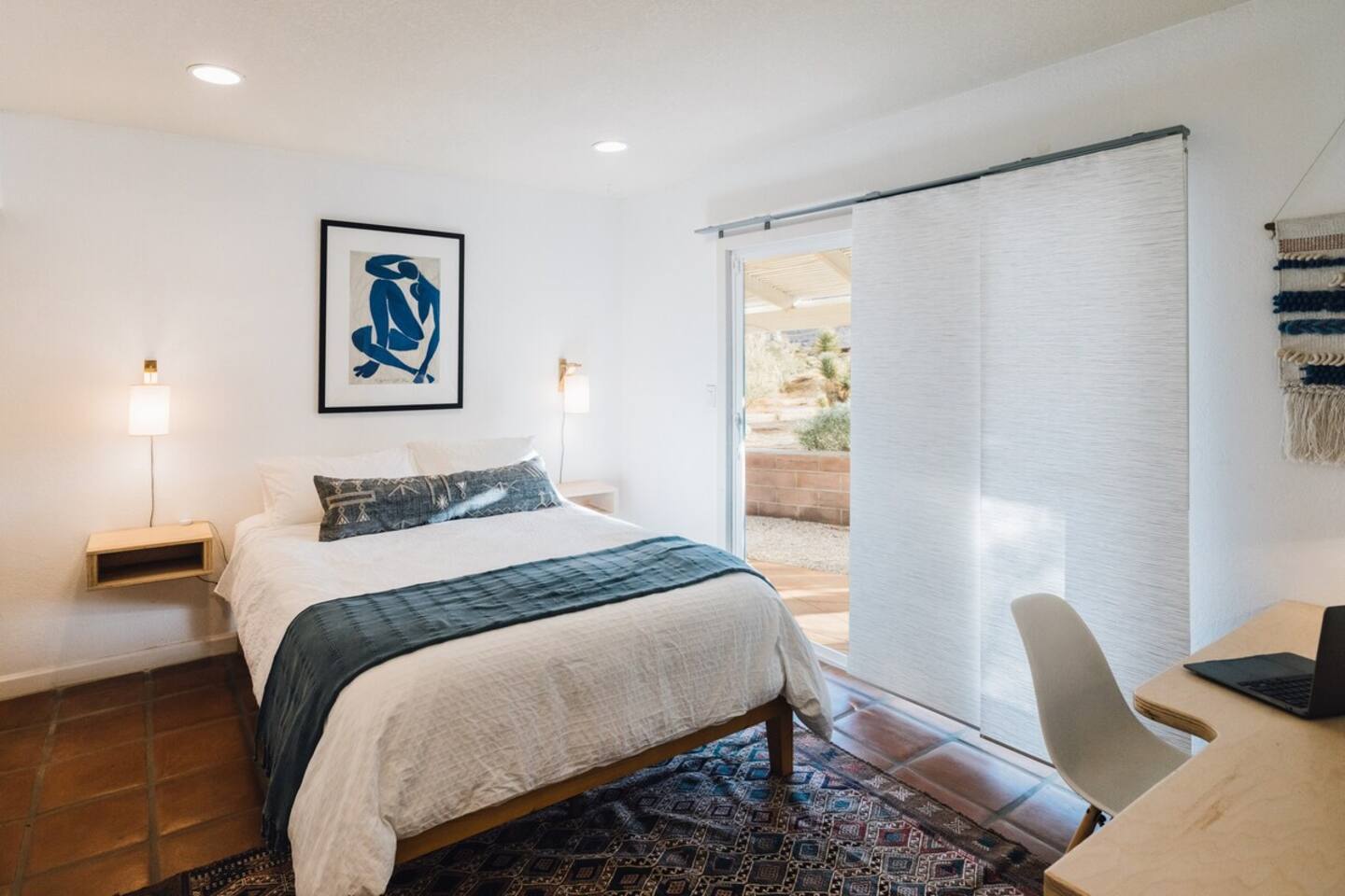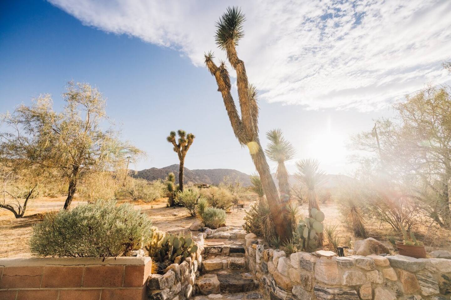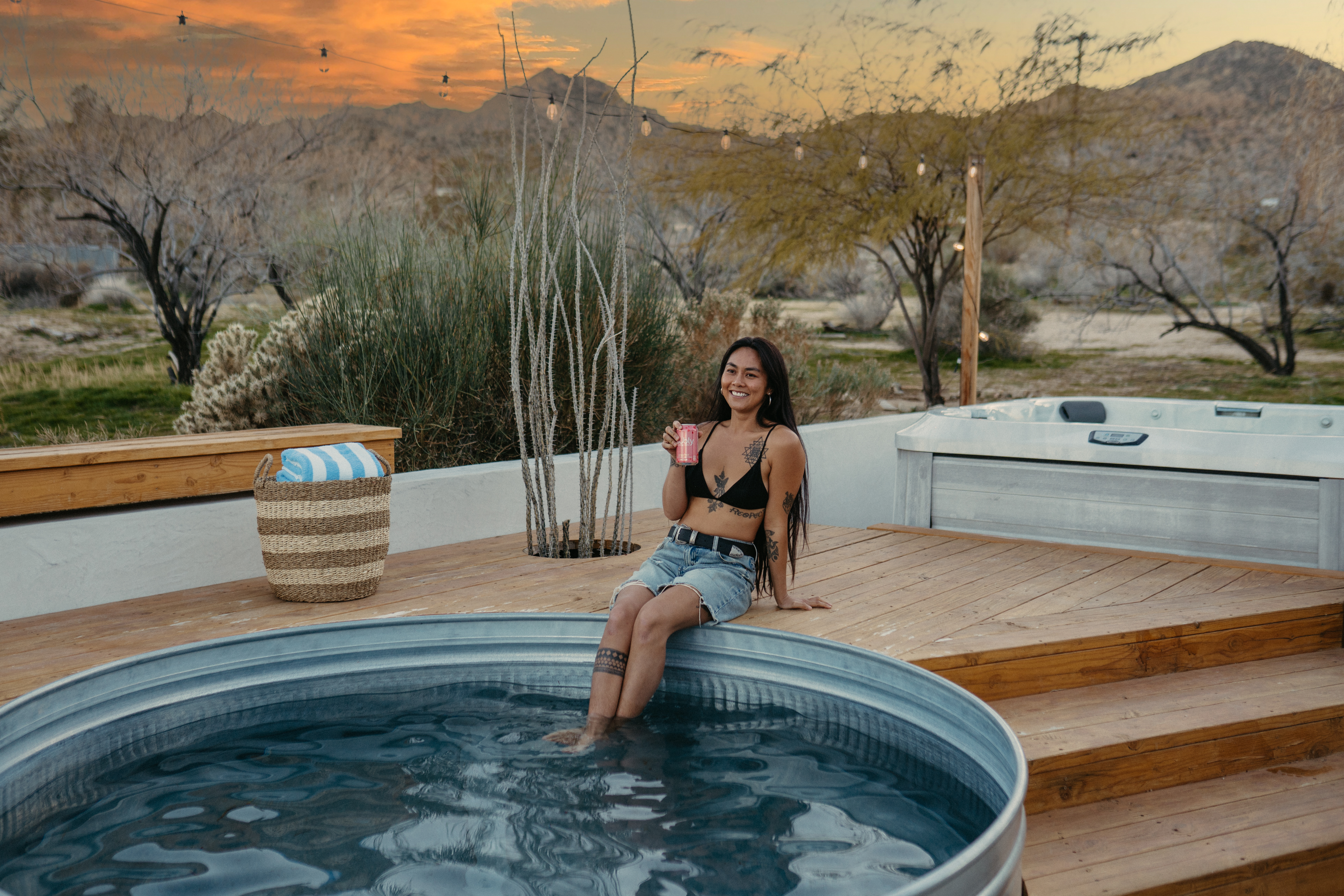 Sleeps 7 comfortably, up to 9 guests Bedroom 1: King bed Bedroom 2: Bunk bed (Twin XL over Queen) Bedroom 3: Queen bed Additional guests 8-9: Fold-out memory foam twin mattresses available ($25/person/night) Pack-n-play available for babies. The Perfect Location Roadrunner Ranch sits in Joshua Tree Highlands—the area's most coveted neighborhood. You're 4 minutes from downtown Joshua Tree in one direction, 4 minutes to the park's west entrance in the other. The property is directly off paved Quail Springs Road, while most rentals in the area require long drives down rough dirt roads. Location is consistently our guests' favorite feature—and for good reason. Key Amenities: ★ Hot tub + stock tank soaking tub (April-October) ★ Outdoor movie theater with projector ★ Built-in L-shaped couch with fire pit ★ Covered patio dining for 8 ★ BBQ area with Weber grill ★ Open-concept kitchen with stainless appliances ★ 2 full bathrooms (primary ensuite with rain shower) ★ Front porch with sunrise views ★ Hammocks ★ Horseshoe pit ★ Built-in desks in 2 bedrooms ★ TVs with Roku in living room and bunk bedroom ★ String lights throughout ★ EV charging (Level 2 J1772) Layout & Living Spaces The open-concept layout flows seamlessly from living room to dining to kitchen—ideal for gathering. Floor-to-ceiling windows frame sweeping desert views, while a striking local stone fireplace (decorative) anchors the living area. The fully-equipped kitchen features stainless appliances and ample prep space. All beds feature premium mattresses and hotel-quality cotton linens. The bunk bedroom includes a TV with Roku and closet storage for the fold-out floor mattresses. Outdoor Oasis The outdoor crown jewel: grab blankets from inside the sliding door and enjoy movies on the big screen from the built-in fire pit couch. Set up the portable projector (2-3 hour battery, extension cord available) and let separate string light controls set the perfect mood. When finished, return the projector to its spot inside. Adjacent to the fire pit lounge, unwind on the open-air deck with a hot tub and stock tank soaking tub (filled April-October). Start mornings on the front porch with coffee and sunrise views over the desert. The covered back patio offers dining for 8 with a Weber BBQ—perfect for meals with mountain vistas. Explore the property's stunning joshua trees, cacti and other flora, lounge in the hammocks by the large willow, or challenge friends to horseshoes by the mature joshua trees. The Cabin A separate 2-person cabin sits 150 feet from the main house with its own driveway and complete privacy—typically rented independently, but available to add to your reservation. If occupied by other guests, you likely won't see or hear them.