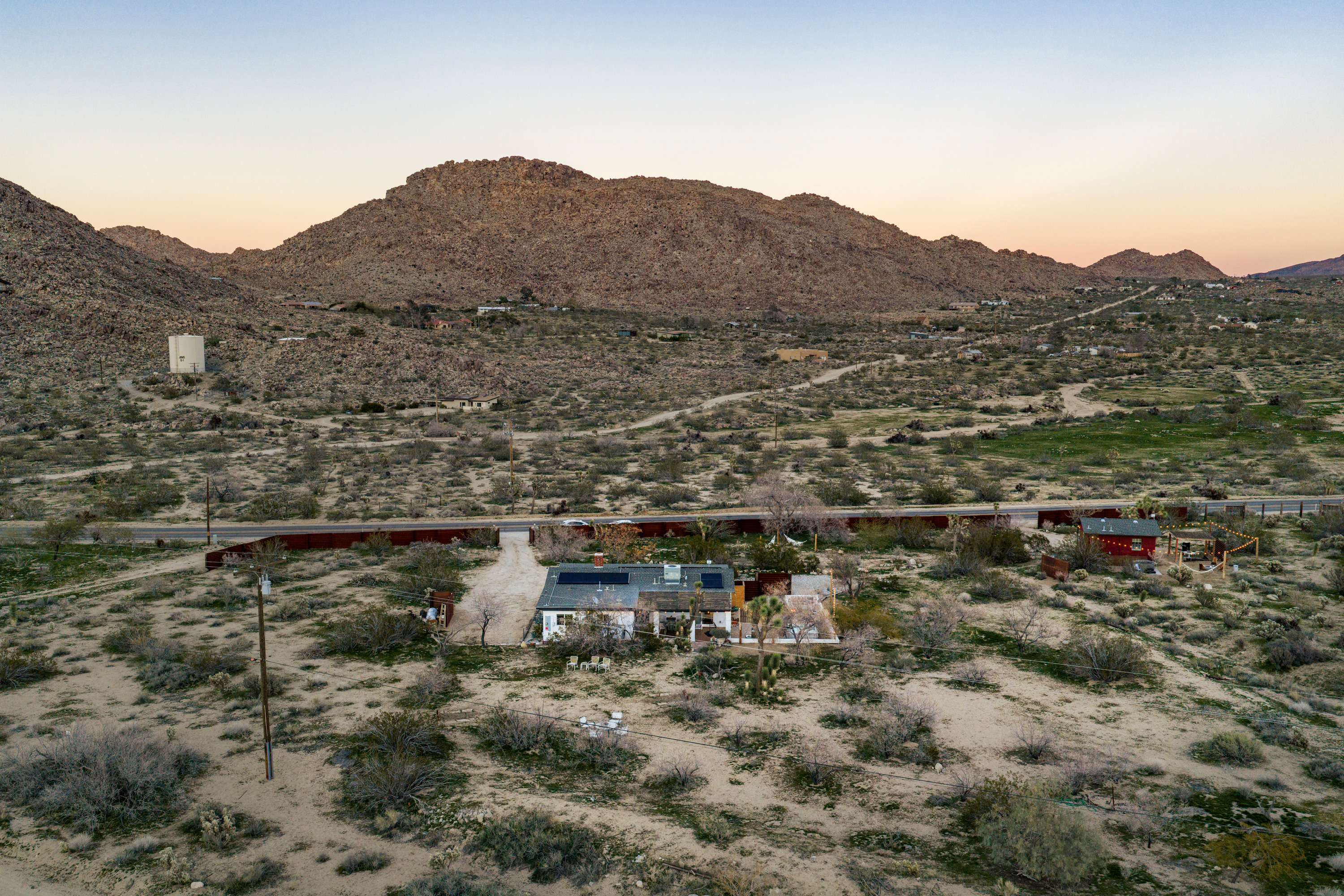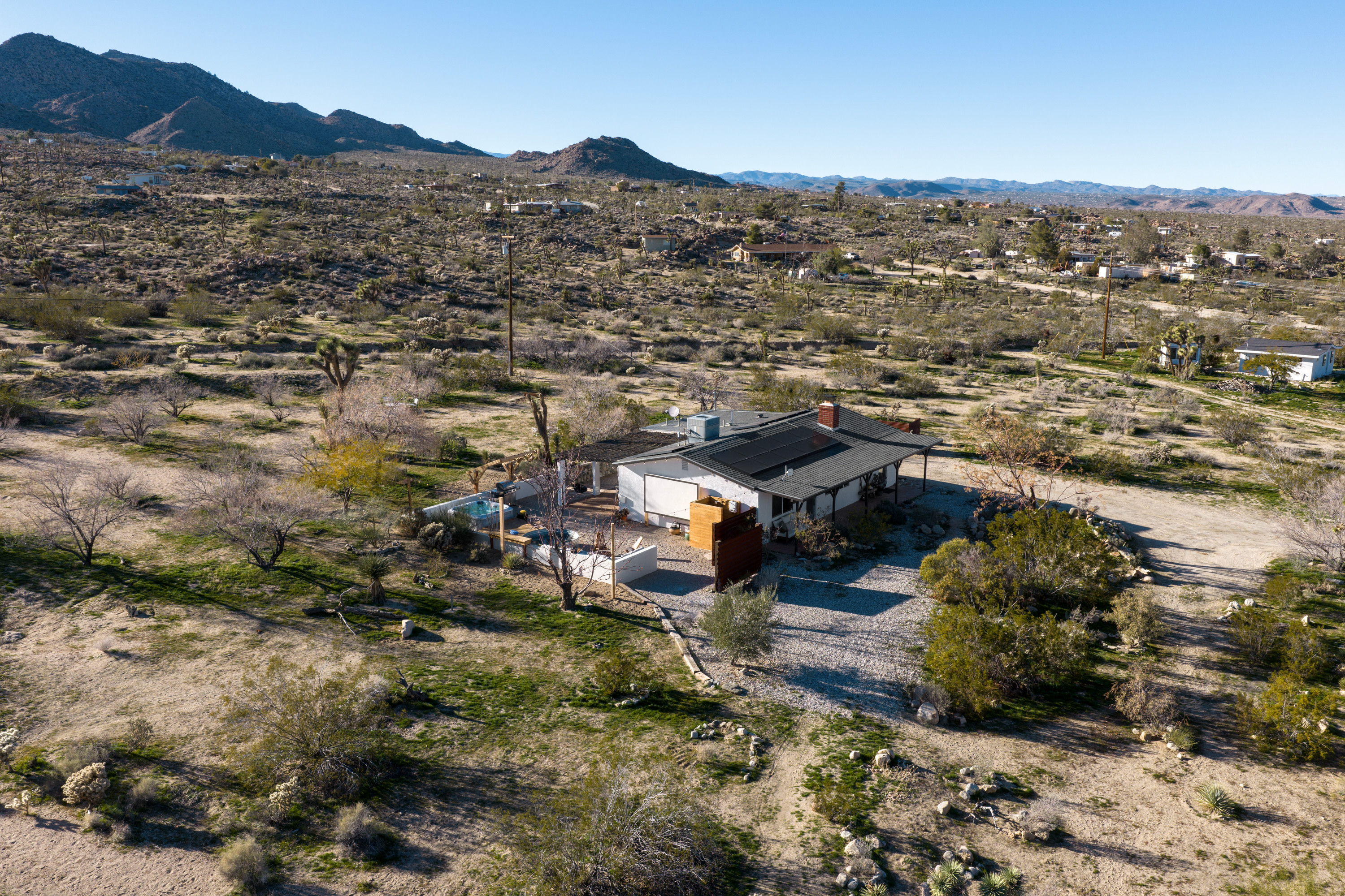 The home is in the quiet Joshua Tree Highlands, the most beautiful and convenient area in Joshua Tree. You'll be only 5 minutes from the national park entrance in one direction and 5 minutes from the town in the other direction. The home is one of the few in the area on a paved road for easy access, yet has plenty of privacy and is surrounded by stunning scenery.