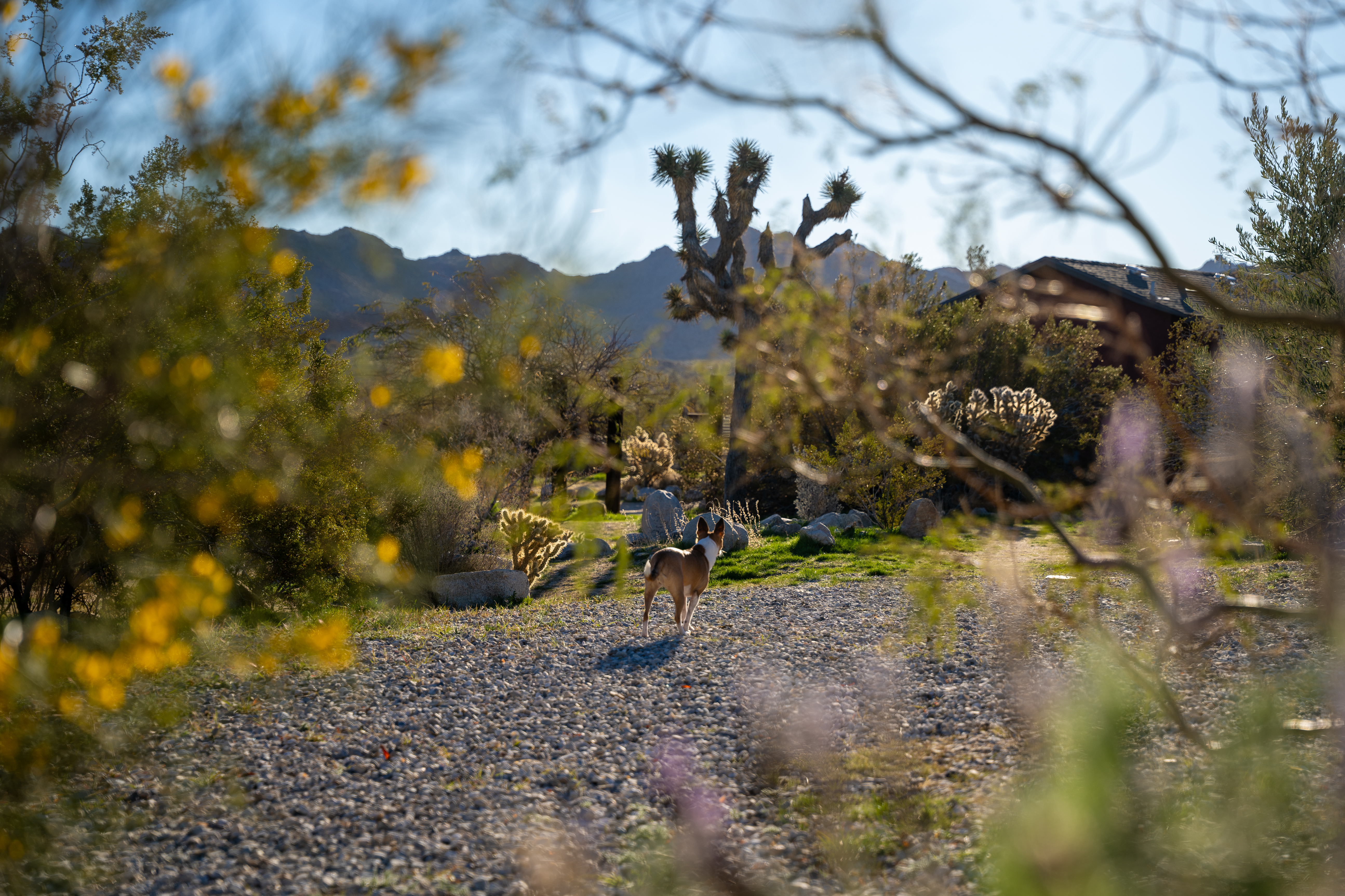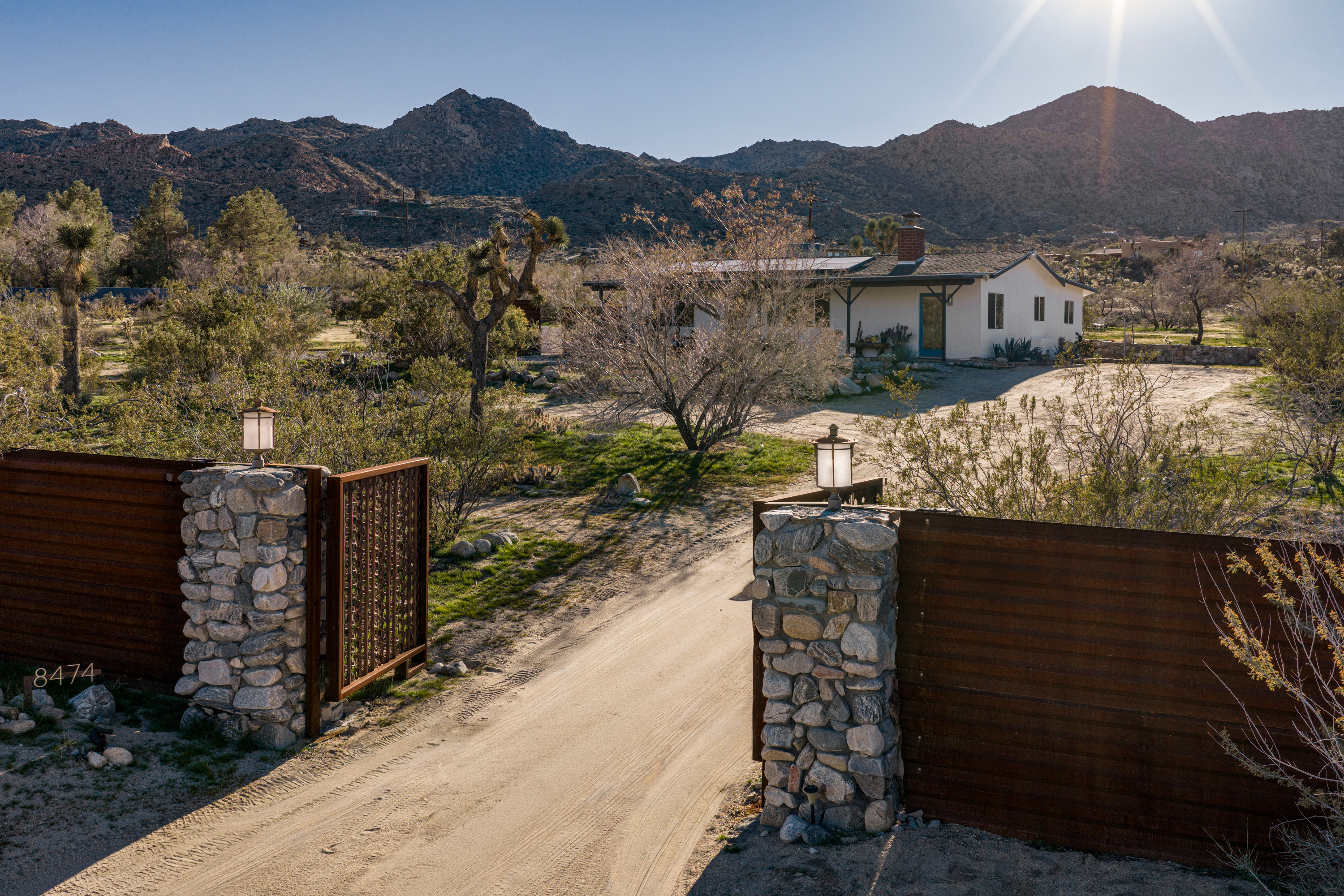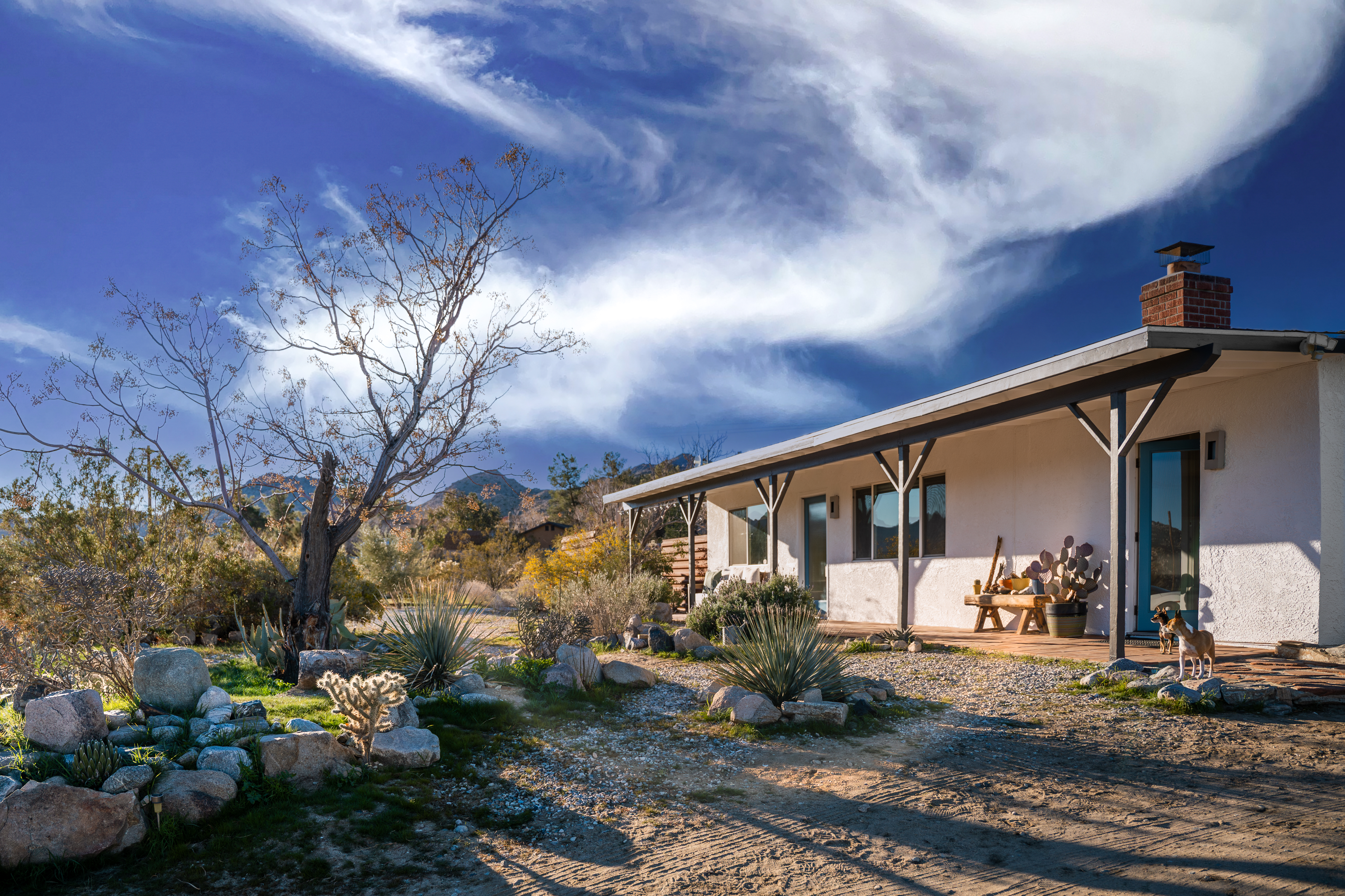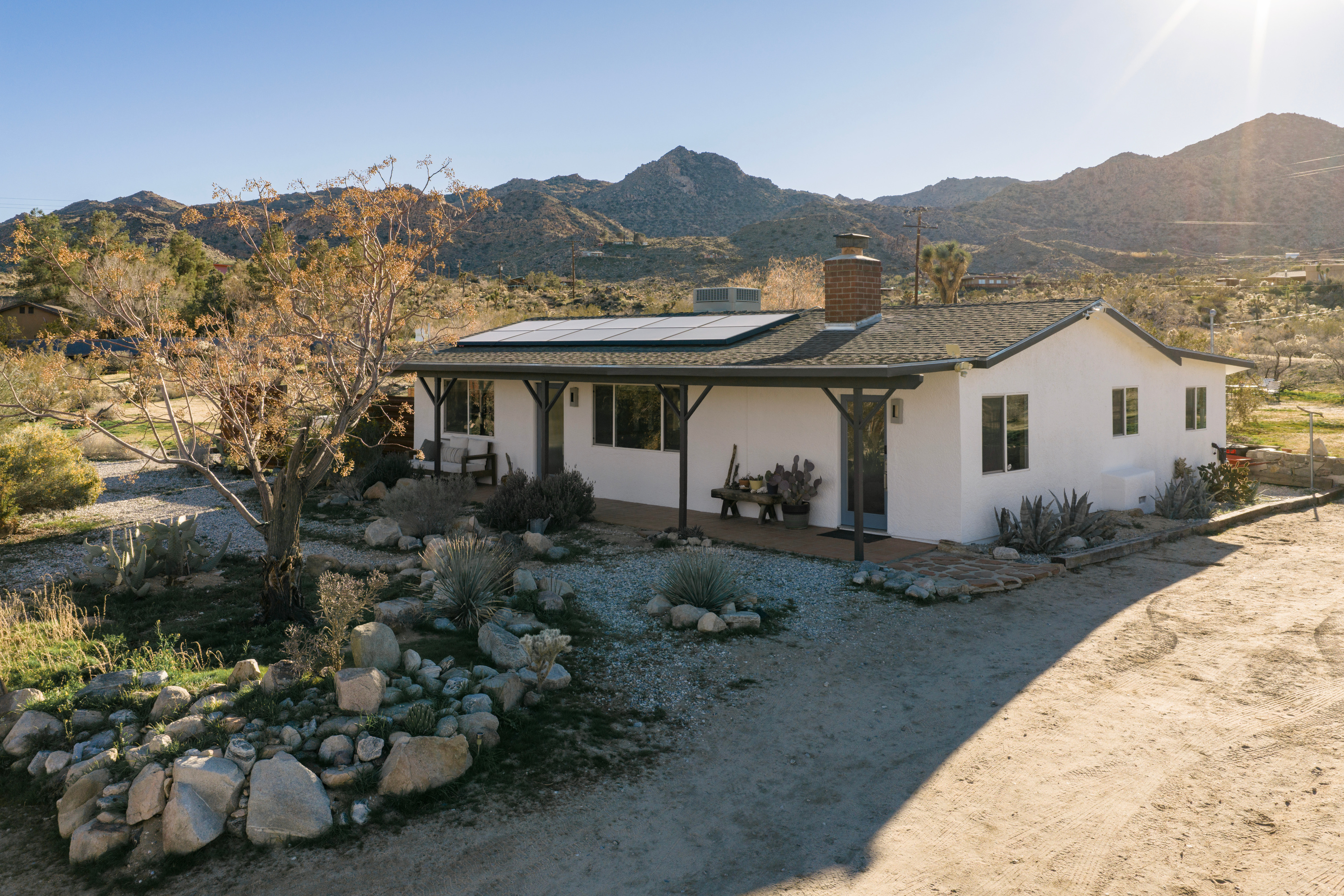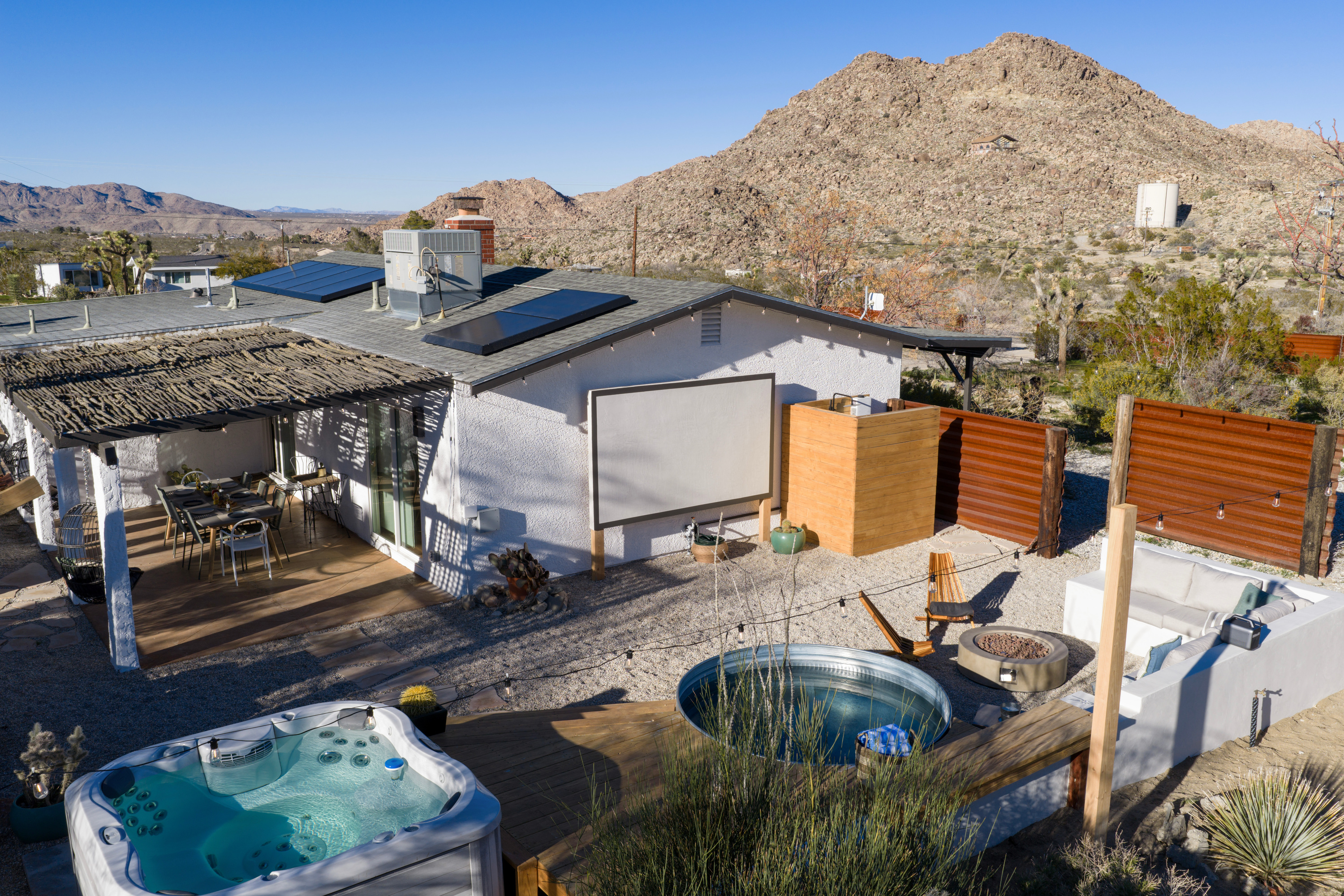 Welcome to the Roadrunner Ranch! Ideally located on a private lot with mature Joshua trees and native cacti, just 5 minutes from the west entrance of Joshua Tree National Park and town. Spot roadrunners and jackrabbits from the outdoor cowboy tub and shaded patio, get cozy under a blanket on our built-in couch watching movies on the big screen, or soak up the starry night sky from the hot tub!